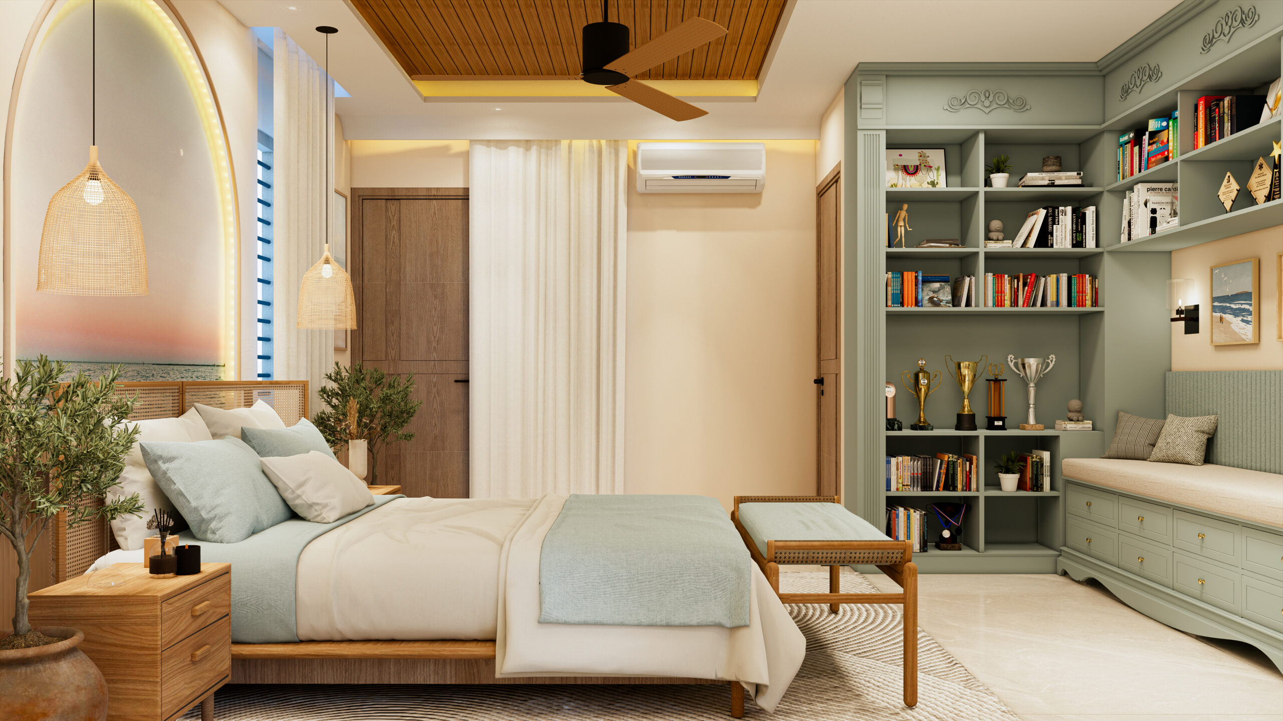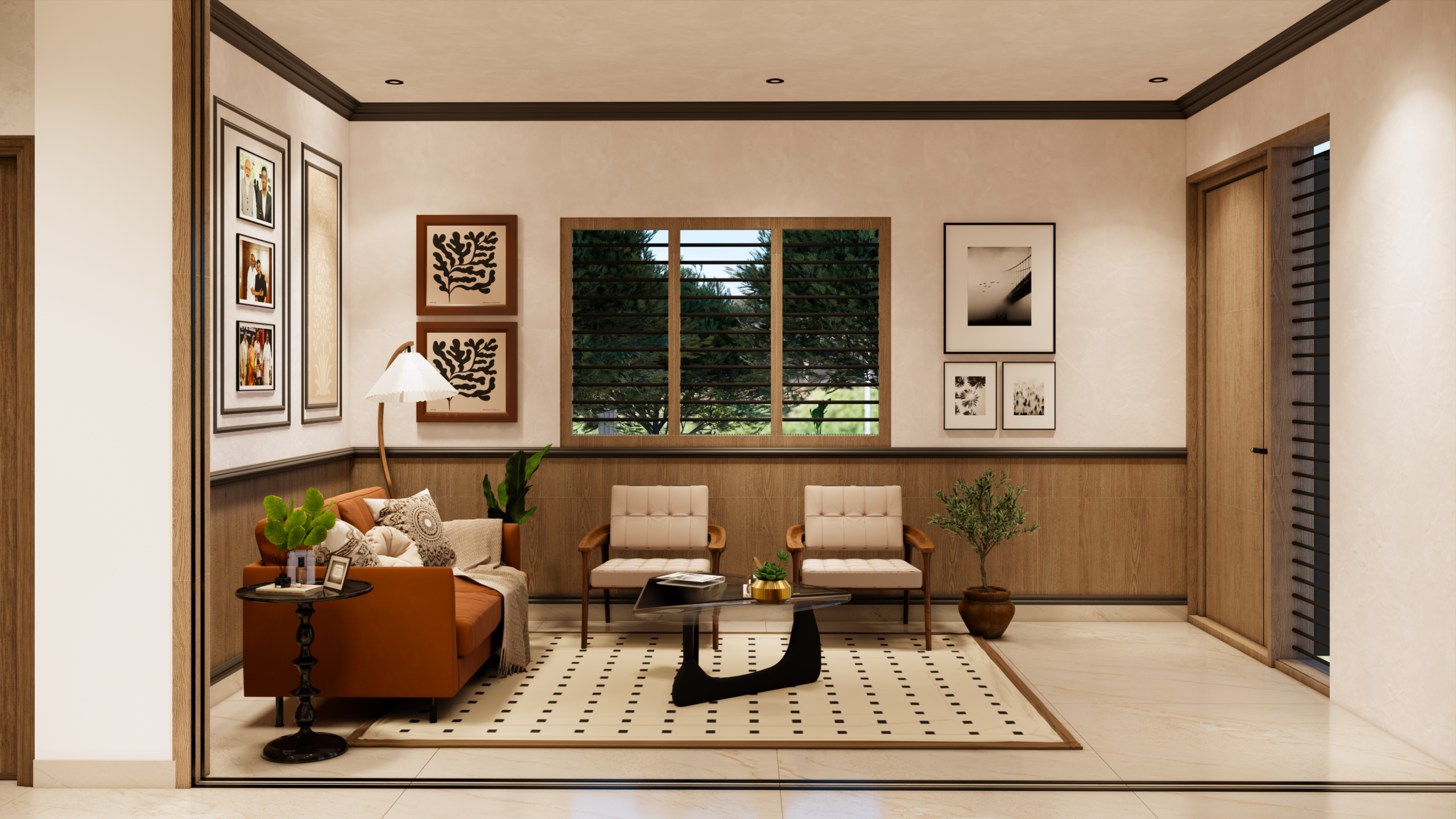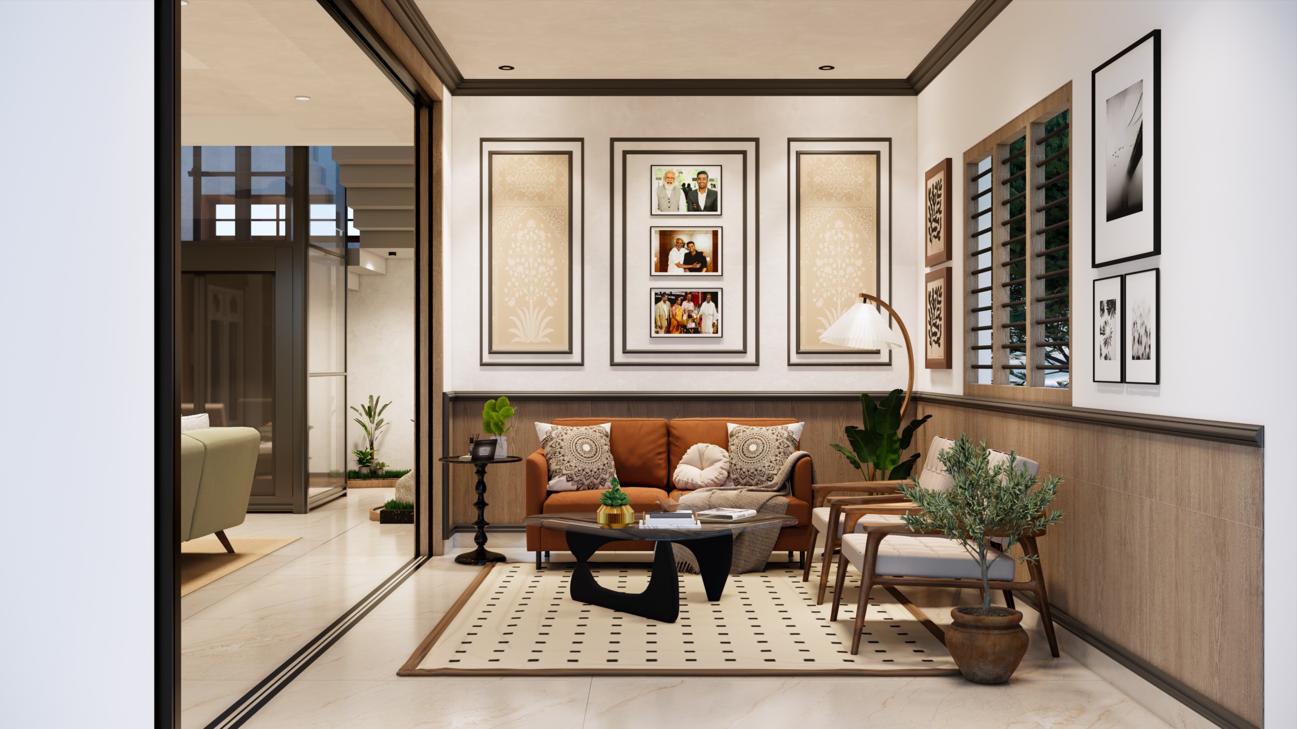 textures, warm lighting, and expansive transparent facades.