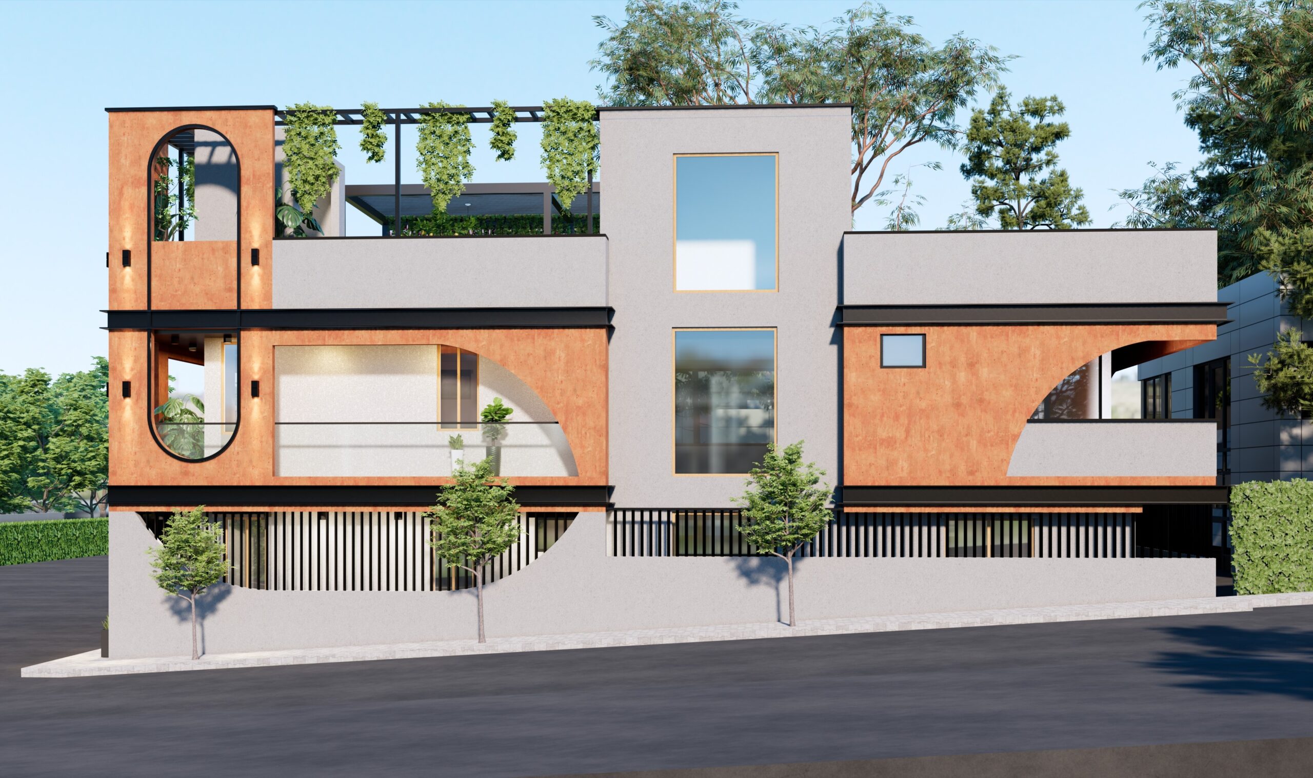 Designed for Niranjan Mukund, an accomplished athlete and multiple Asian record holder, this 4BHK G+1 villa reflects strength, precision, and modern elegance. The façade blends bold geometric forms with warm textured finishes and abundant greenery, creating a highly contemporary yet grounded architectural expression. Large openings, curved frames, and a striking combinationof grey and terracotta tones give the home a distinctive identity.