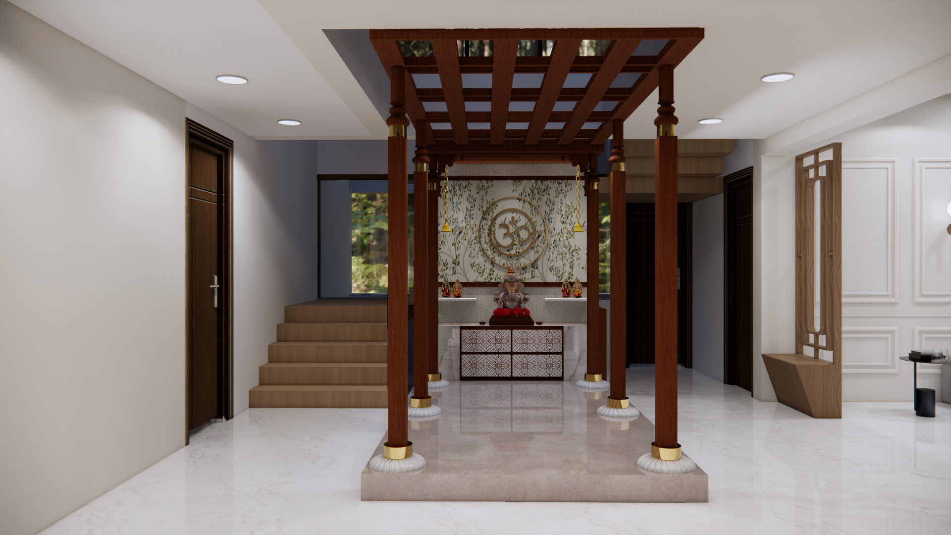 The ground floor features a double-height living and dining area, a puja room, spacious kitchen, two parent-friendly bedrooms, and a lush terrace garden that serves as a serene outdoor retreat.